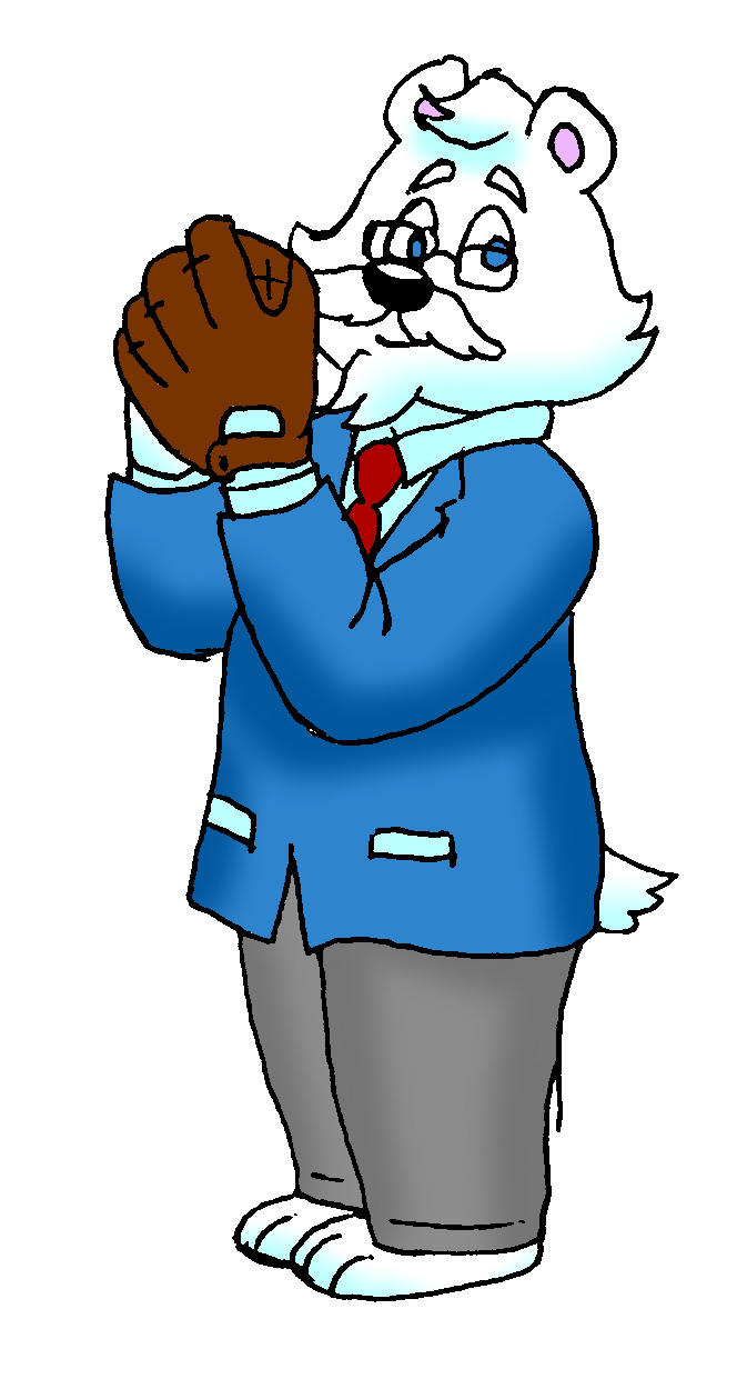 toony polar bear wearing a blue blazer with blue tinted dress shirt and red tie, and gray dress slacks. Wireframe bifocals. Has a moustache and goatee kind of like Col. Harland Sanders has.