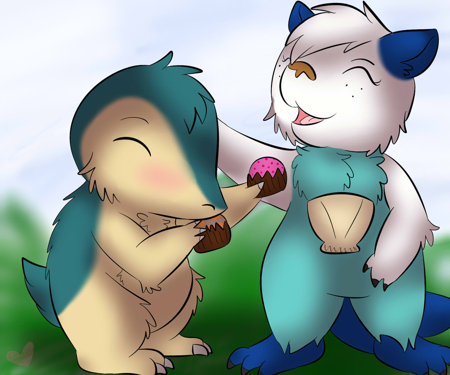 cyndaquill is sharing his pokepuffs with her!