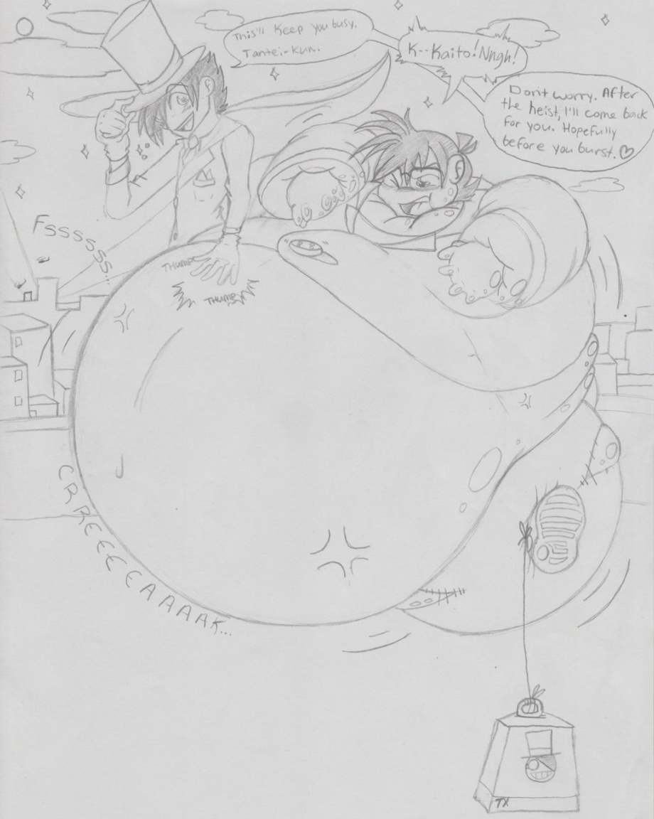 Backstory here, for those of you who don't know Conan -- Kaito is always... figured out by the detective, so this time when he staged a note for the kid, when he arrived, Kaito popped a few... modified smoke bombs down Conan's throat, keeping him occupied [thank you cartoon physics] while he flies by to preform another heist. [ Is heist even a word? Fuck you, dictionary. ]
