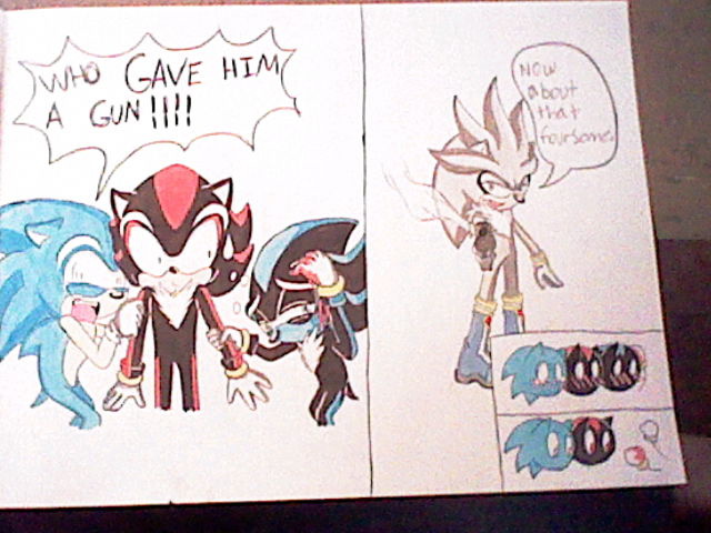 while fighting mephiles shadow draped his gun. Silver then picked it up an asked for a foursome. the three thought he was kidding and Maphiles laughed. Silver then shoot Mephiles cuz he was dead serious >XD
