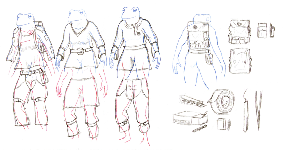 Some sketches from the early development of Vicky. including kit items and outfit variations.