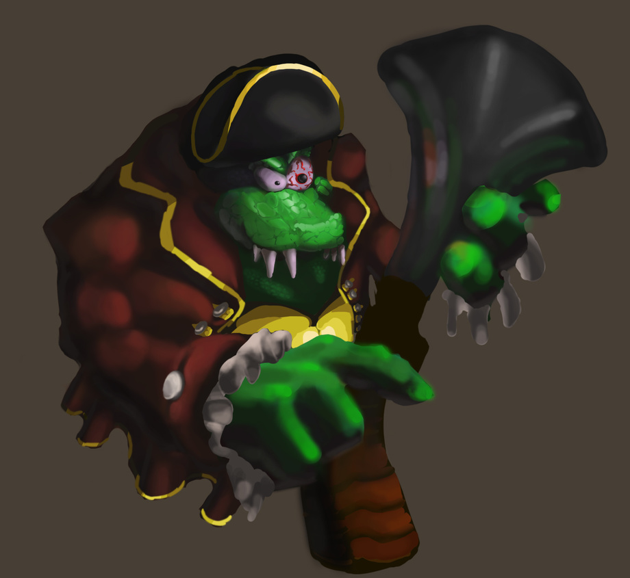 Digital painting circa 2008 of K. Rool in his pirate outfit, my favorite videogame villain. I never did finish it, but still worth a look... heh!