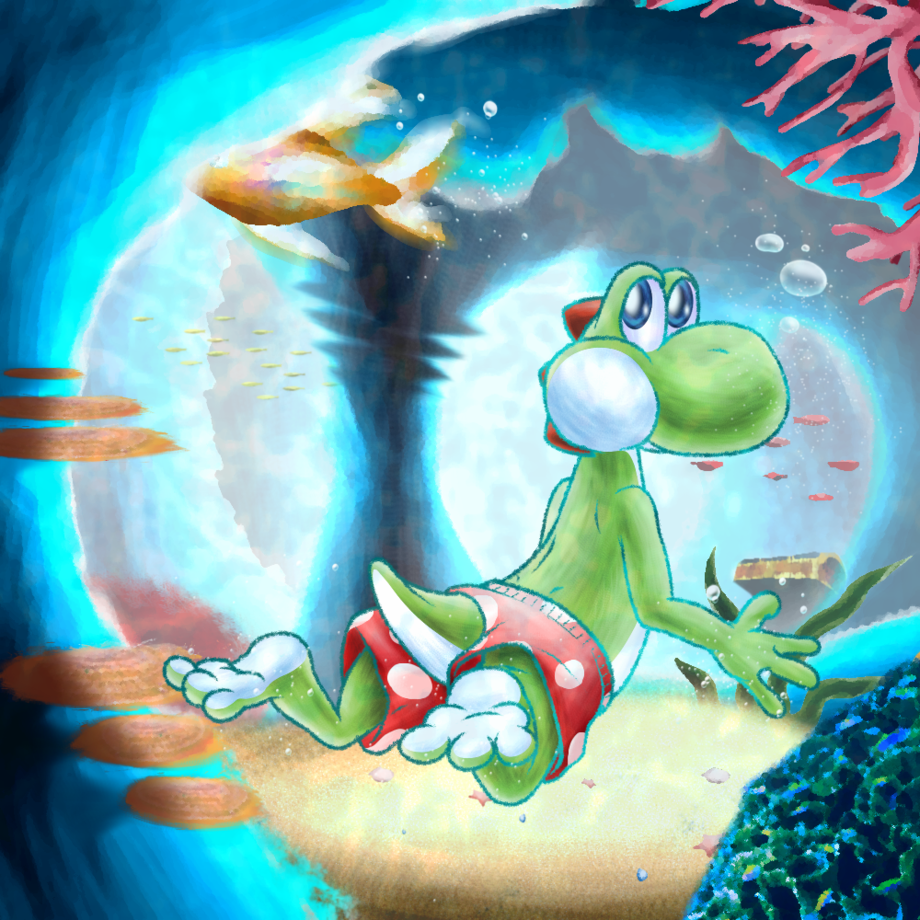 Requested from MystFoxcoon on Deviantart a bit less than a week ago. Ain't it lovely? If it's not my finest work yet, it's surely one of the best! He asked me to draw Yoshi underwater, so here you have it! :D