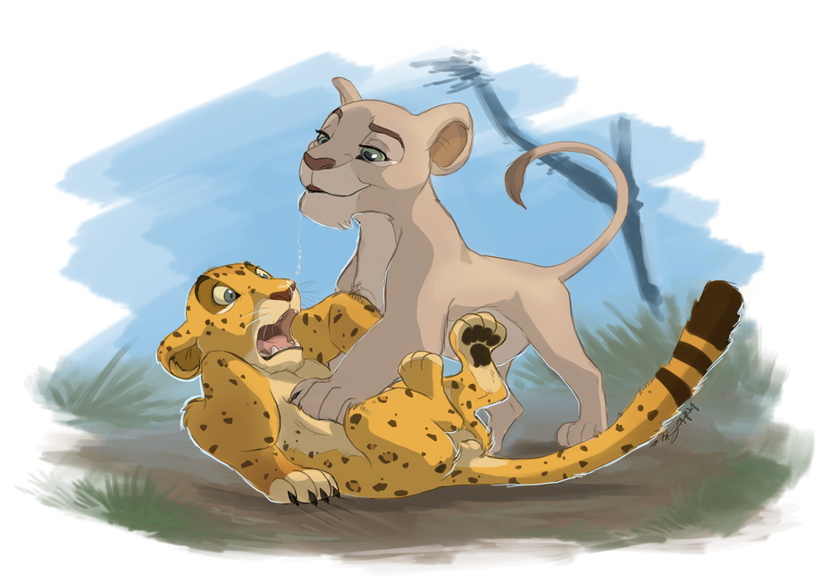 Meo (the boy) is looking at the tip of his nose, because Nala's drool has caught on to it. :) Nala is sort of looking "down" on him, in a way that she holds her head higher than normally, so she can actually drool over his head rather than his chest, where she was originally poised at. Then her body was changed twice: her backlegs shrunk and head enlargened to give it 3D. The recolor disorder, ... I saw that the shadow positions were changed and altered a few times, and the basic orange color for Meowz was changed entirely on my request, and his underside too. The fine white likes surrounding some outlines were added by hand. I didn't find them bothersome to look at, but I guess I could've just said "no I don't want these". So, I guess if this looks a little messed up to you, that'll all by my fault XD.
