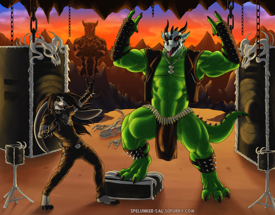 A commission that also counts as personal art featuring myself and my buddy Varanis. We are metalheads through and through, so we discussed what we should get in a piece of art that features the both of us, and of course the metal topic comes up. :P So here we are, dressed in our best metal-fan garb circa 90's, complete with corpse paint.