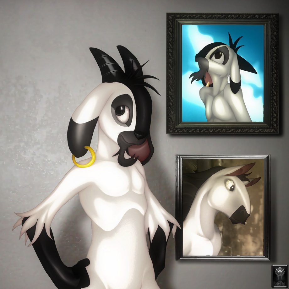 This is such a great atmosphere piece. The picture has a cool kind of realism to it because of the framed pictures on the wall. It seems like a photo any normal person would take, except there is this cute goat character there :) Very well done