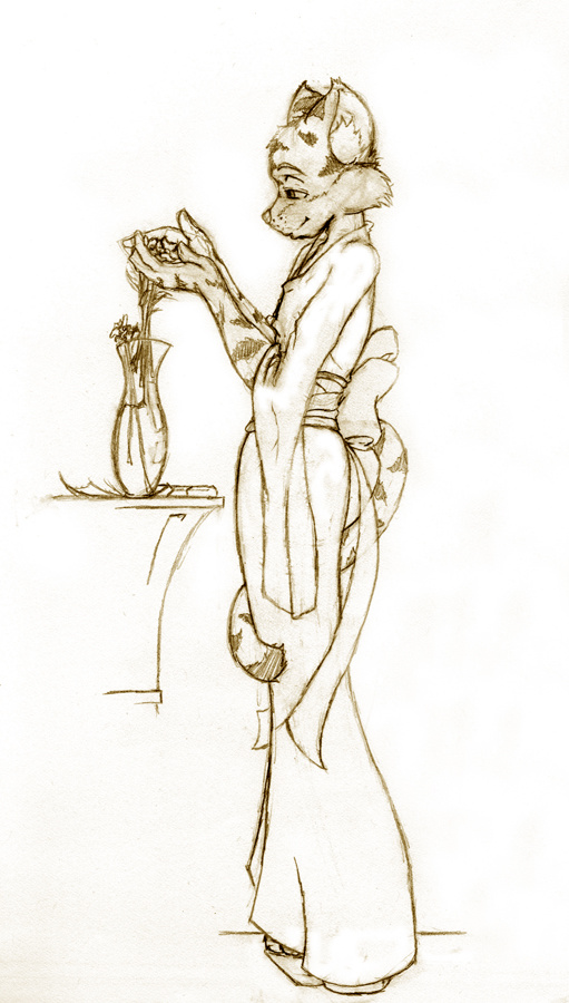 Now older and owner of a Okiya / Tea house, he teaches young girls to one day become geisha. He teaches grace, art, and beauty, yet he tends to do the opposite himself. Smoking, wearing his kimono incorrectly, swearing, and out right fighting bad patrons and students. I guise after years of taking peoples crap and having no choice but to keep silent, he finally snapped a tiny bit. his students learn to do as he says and not as he does. Even though he looks and acts a lil odd, his Okiya has a wonderful reputation. He treats his good students and patrons with respect, kindness, and love.