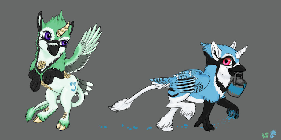 Chibis of Tiprtap and Lutiel being playful little hippogyphs.