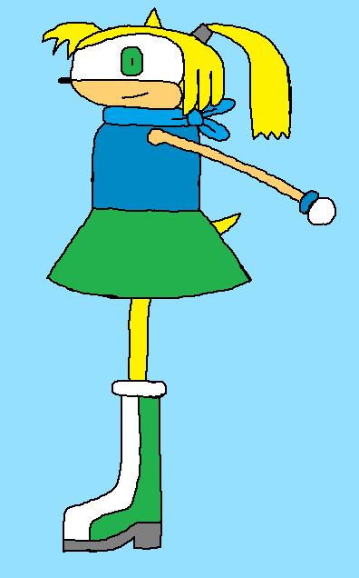 Blue Shirt, Green Skirt, White Gloves, Green and White Boots.