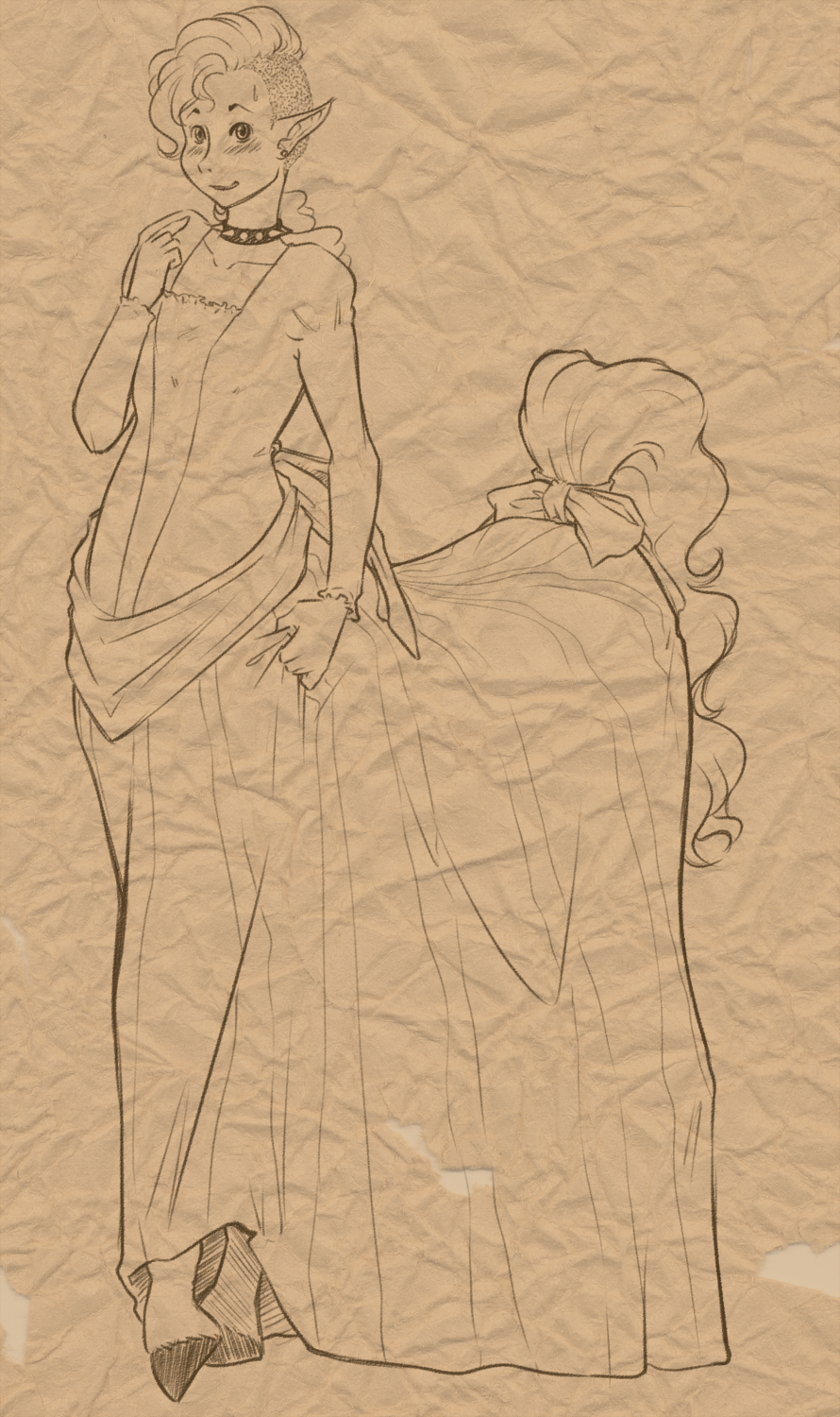 I like to think a friend or SO or someone close to her wanted to dress her fancy and make her feel dainty, so they goaded her into dressing really different. She kept the spiked collar though, because that was too much to get rid of. She seems sorta okay with it but really bashful.
