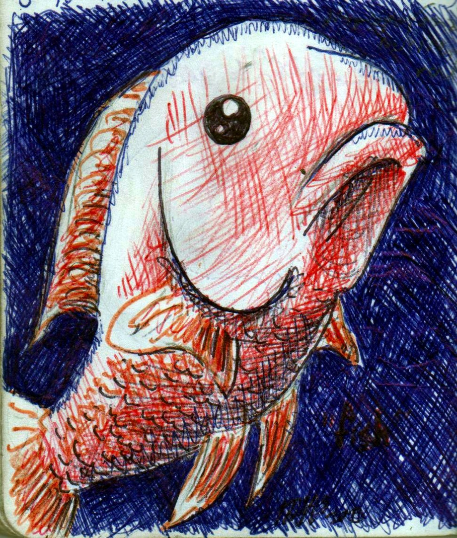 a meticulously inked doodle of a defiantly proud fish. While not apparent in the scan, the original glitters dazzlingly