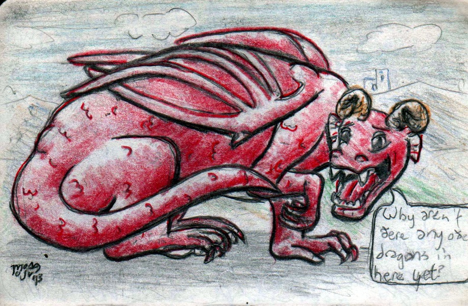 At the start of a new sketchbook, and with the castle in the far background, this red dragon ponders its loneliness