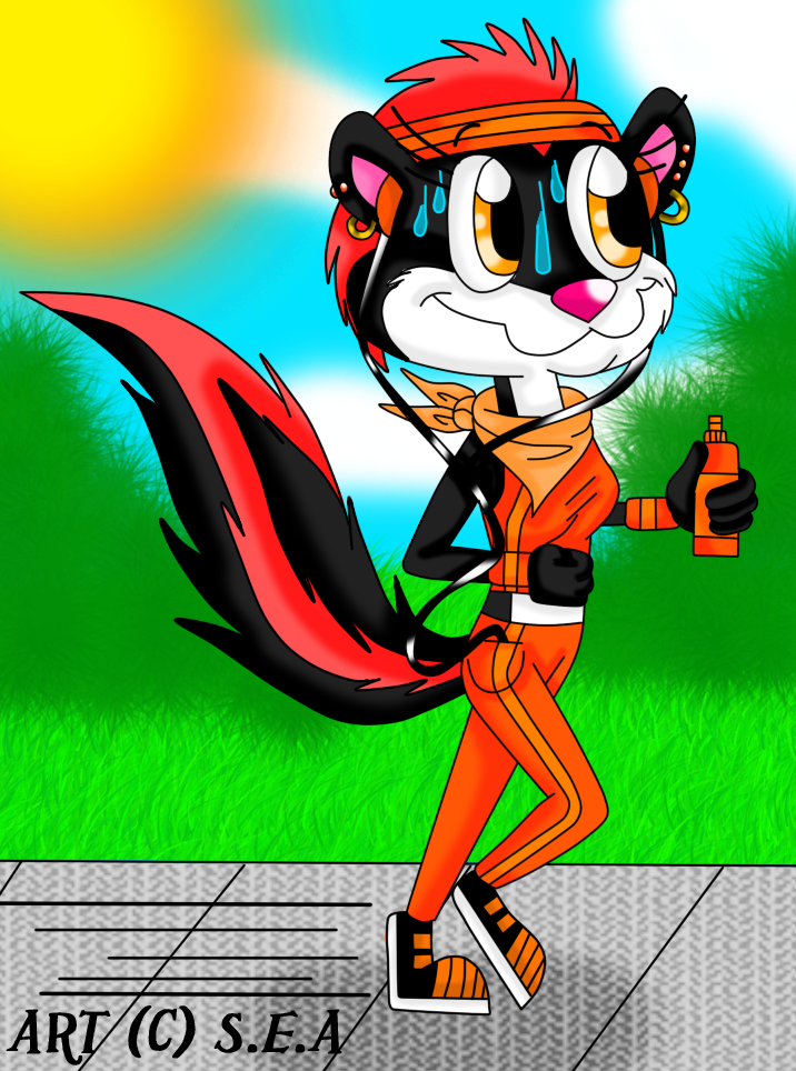 Here's my skunk character Stacy out for a pleasant jog around the neighborhood with a water bottle and CD player.
