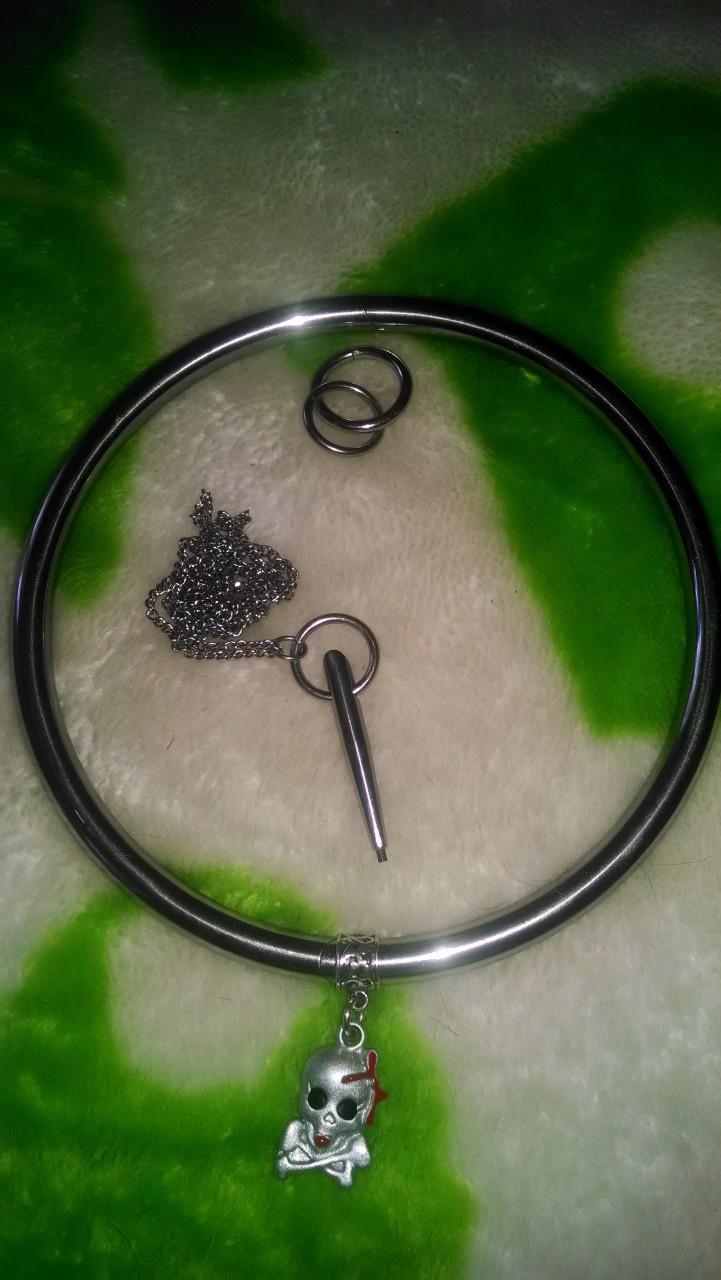got me a new collar to replace the other one I had not lost. The thing in the middle is the key he has on him at all times. The 2 rings are lead rings that can be put on. The skull pendent on it can be taken off and replaced to with other. Thay slide on and off easily.