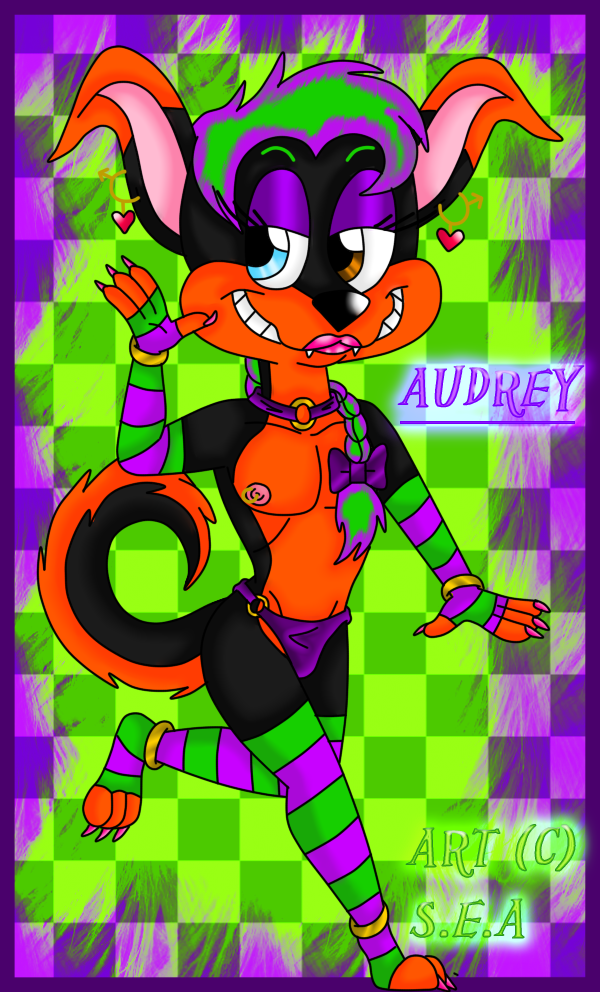 This is my character Audrey Azure he's a husky/rottweiler mix, his favorite colors are Purple and green, as you can tell from HIS looks he's a crossdresser.