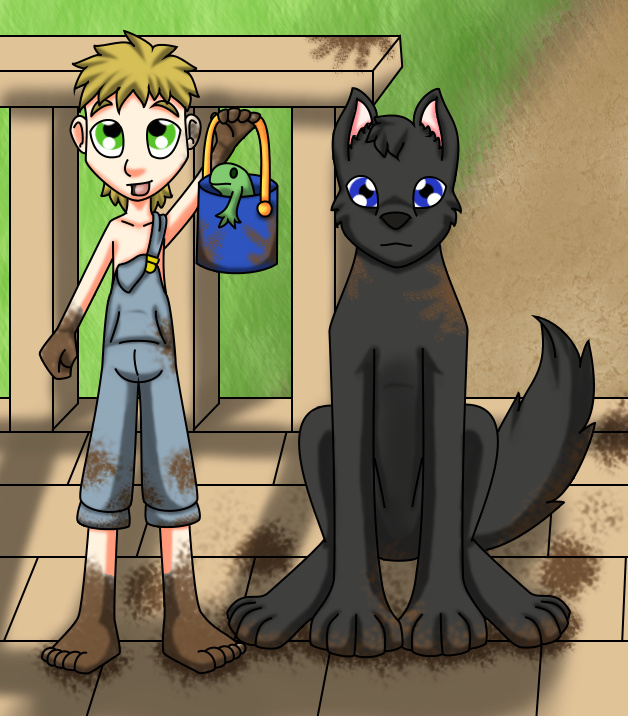 "Look Mommy! Me and Dire caught a frog! Can we keep it?" Jay asked holding up his bucket as the Frog in it popped up and his mom took in the sight of the Muddy boy and only mildly muddy dog.