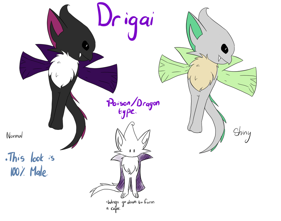 Drigai seems to resemble a bat. It's overall fur color is black, with a massive fluff on its chest. It has wings and what seems to be a fan on its neck, colored dark purple. It has black eyes, and inner ear and spikes on its long tail are dark pink. When the Drigai is not flying, it's wings go down behind it, to resemble a cape. The females are a dark purple, with a black chest fur and fur on the tip of her tail. Her wings are completely black, and she has 2 tufts of fur on her head. Her tail is long, and her ears have a flap of skin that covers the ear. This flap opens when the female uses SUPER SONIC Hearing. This Pokemon seems to resemble a vampire bat, once the wings are down, the female seems to resemble a vampiress in a black dress. It is a Poison/Dragon type Pokemon. It is unknown of its origin in the Kalos reigon.