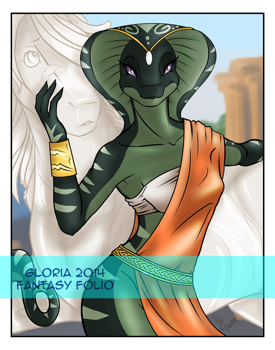 Meet Gloria, this isn't the first time I've drawn her, but the last time she didn't have a name and was tan instead of green. Have to say I really like her this colour. Gloria is a greek cobra naga, with some gorgon ancestry. A lover of fine art, she has a wonderful collection of statues, some having fallen into disrepair, but it won't be long before a replacement wanders into her collection.