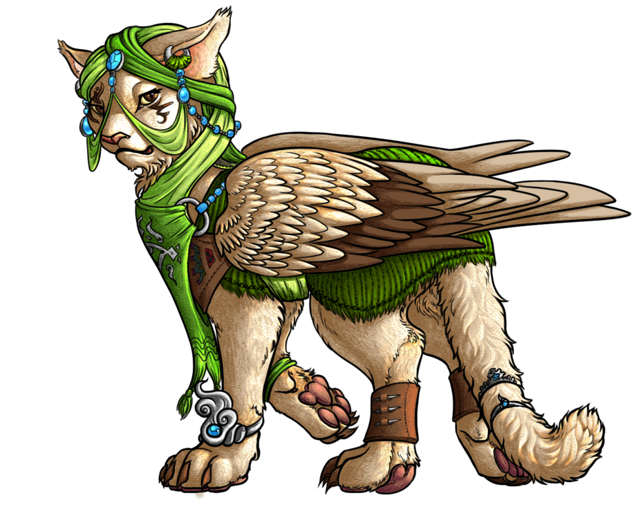 One of the Purrsians, a winged race of flamboyant and jewel-bedecked felines, a playable race in the Ponyfinder: Campaign Setting book by Silver Games, LLC