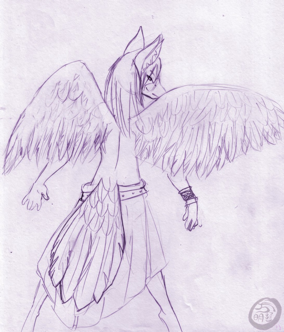On the urging of a few friends, *Glares at with a little smile* I've been convinced to post some of my sketches. This is an old sketch I did of a character of mine from an rp. The rp kind of fizzled out right after starting, but the character still survived somehow. Methinks his interesting backstory saved 'im. This sketch was also a practice for drawing wings. it would appear that I need a good deal more practice!