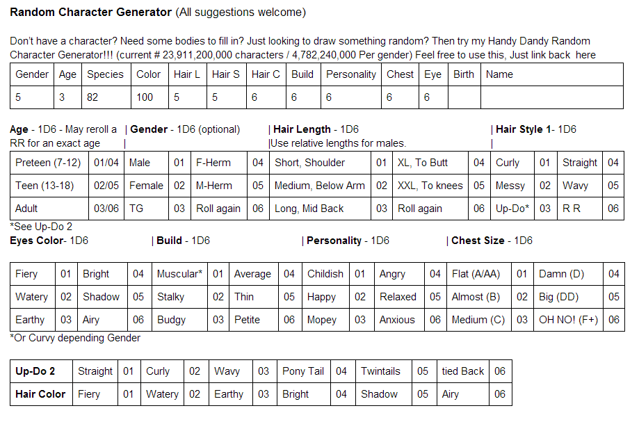 Don’t have a character? Need some bodies to fill in? Just looking to draw something random? Then try my Handy Dandy Random Character Generator!!! (current number is about 24 BILLION characters / 4.7 BILLION Per gender)