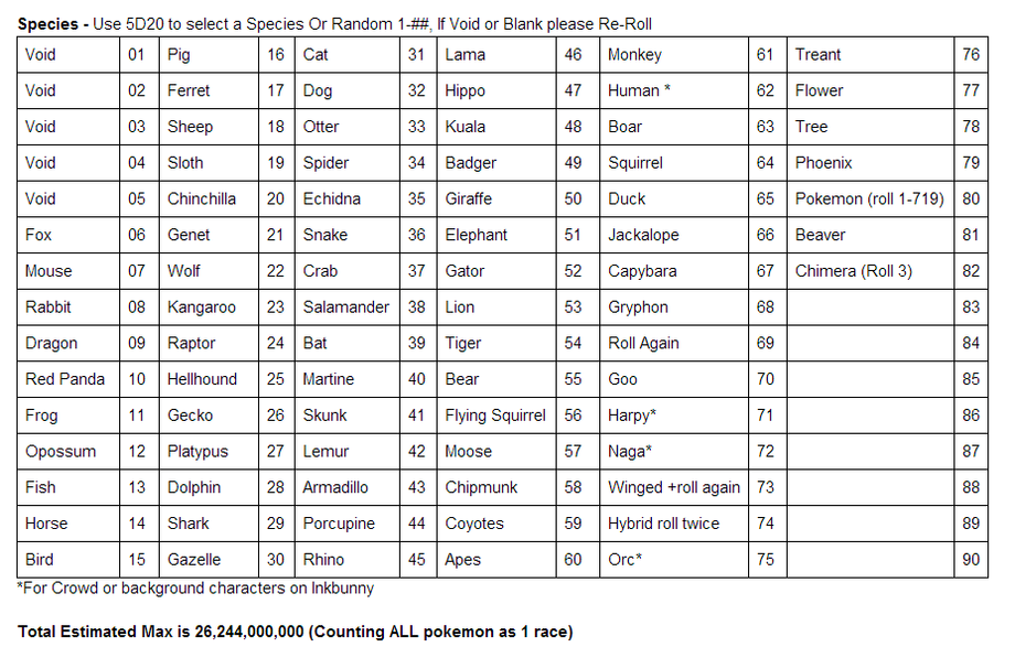 :Edits: Cleaned up some of the grammar, Edited the total # to 24 BILLION (which is more then the Entire Human Population!), and added a Whole LOT more critters Replaced the colors with my own chat, CC 3.0, "Don't Edit, Don't Profit, Free to use and disseminate Just link back to me or this file" Feel free to make your own. After doing the math, This thing has a Max of 26.3 BILLION once completed