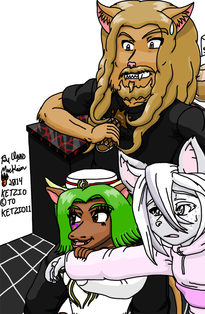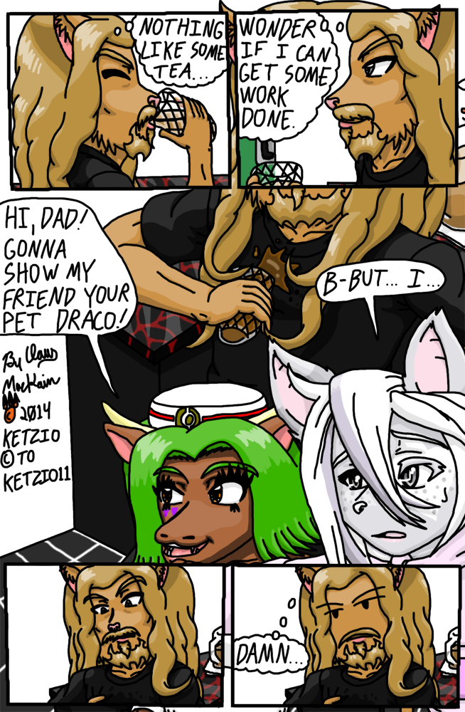 Here Ketzio's a friend of my daughter, Kakurine, and Kaku wants to show her my pet draco, a two story tall dragon. And right as I was about to do some work after getting a glass of tea. The sudden run by of the girls made me spill my glass of tea on my shirt... Dammit... What a waste of tea D: