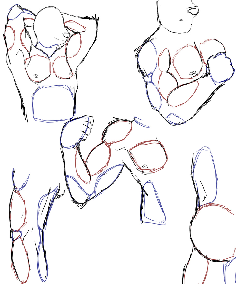 I said in a journal not too long ago that I wanted to start adding more muscular physiques to my art. Well, here's a bit of practice, with red lines outlining the basic points where muscles would be. The blue is for the shapes to make up the rest of the form inside the black lines