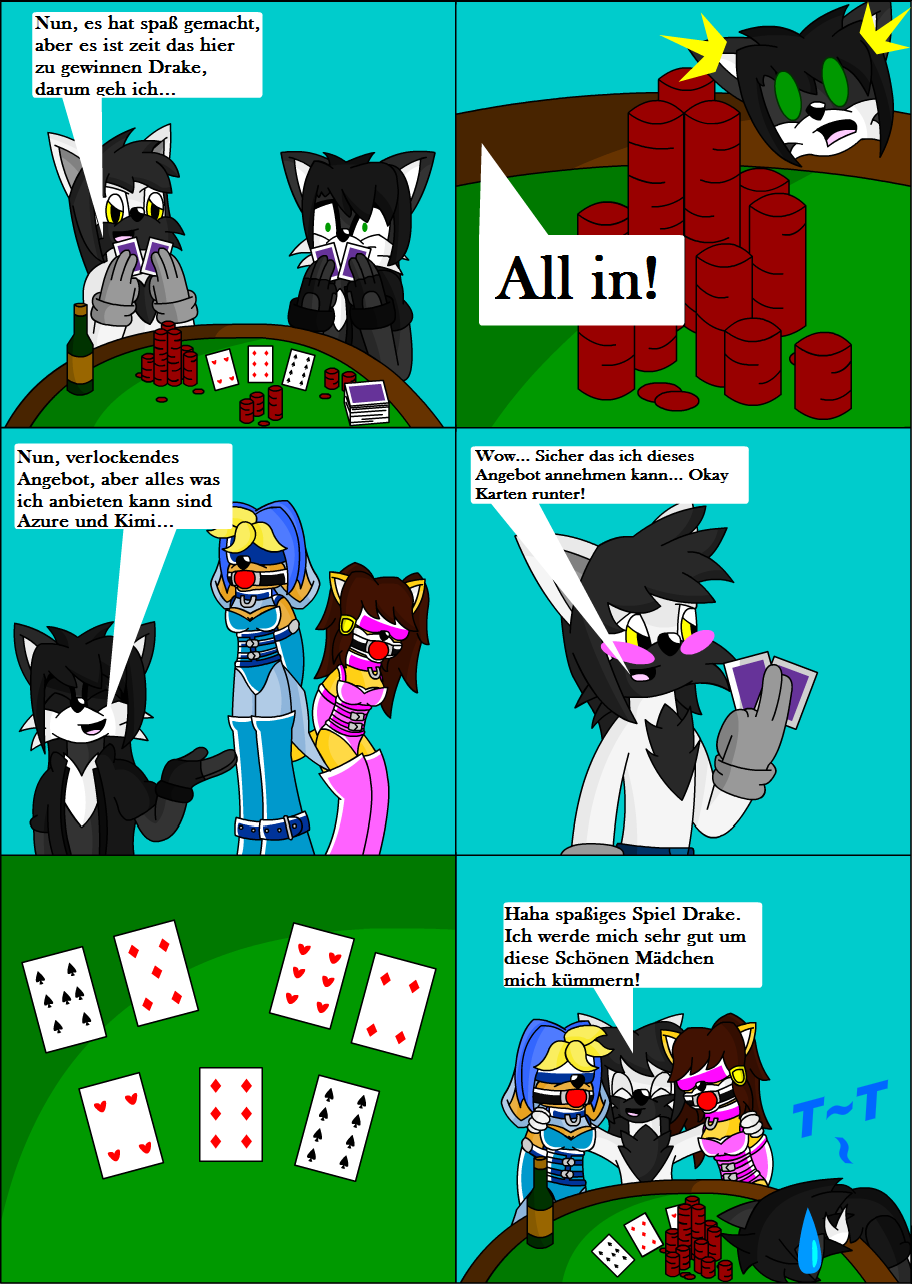 Eine schöne Poker Nacht hatten haben Schiriki und Drake. Drake scheint eine Unglückssträhne zu haben und verliert sein Geld. Er scheint ein gutes Blatt zu haben das er Azura und Kimi als Einsatz gibt aber Schiriki war besser und hat nun den Jackpot geknackt.