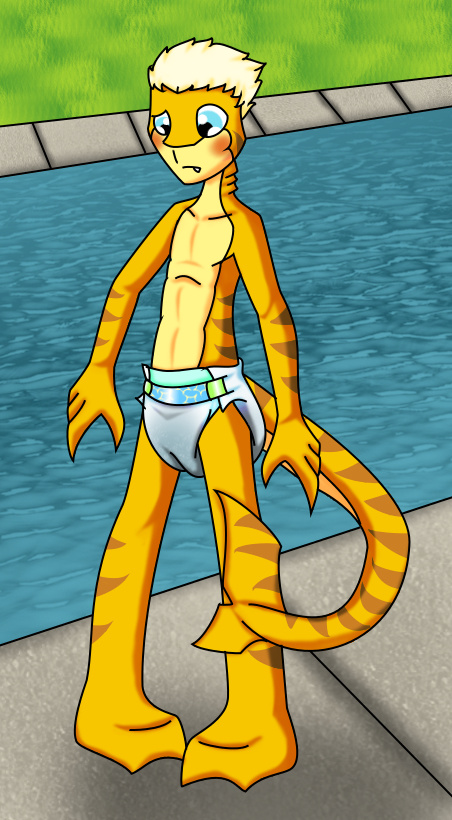 "Oh sure! Well time to go meet the new Shark and Orca. Here I come!" Nerio grinned and dove into the pool not even registering Willy telling him to wait a second. Of course as he swam his diaper immediately bloat up in the water and wondering what was going on surfaced to climb back out. As he did he felt the diaper sag lower on his his and with a look down to confirm it Nerio blushed standing there in his water logged diaper that was most definitely NOT a swim diaper as he'd thought.