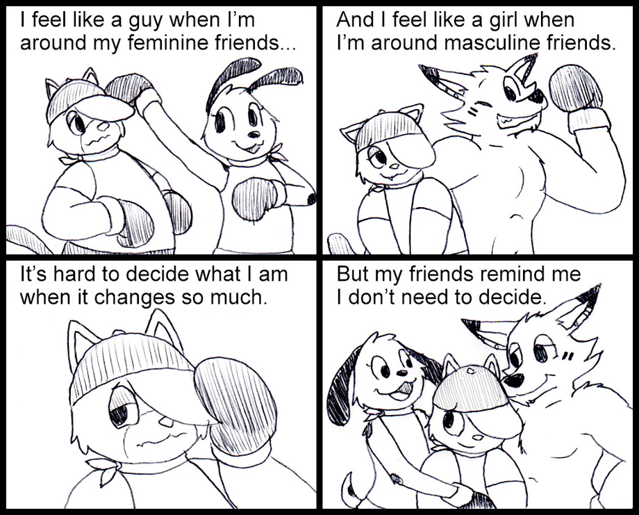 My character Chris has a tough time figuring out what gender suits 'em best - and would love to just ignore it, but can't help but think on it lots. This is just part'a why they have some confusion over it.