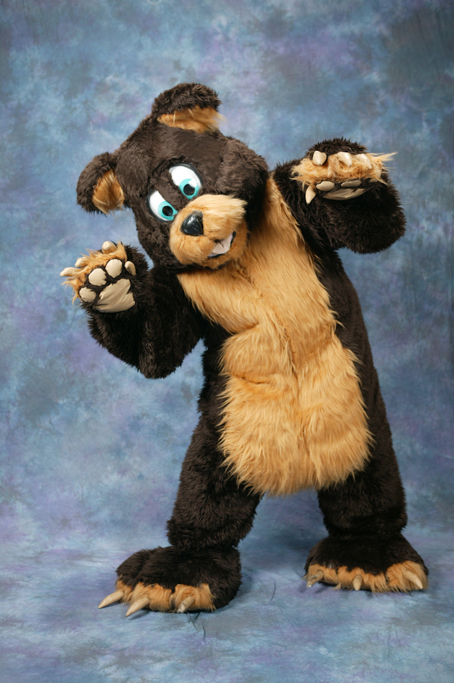 I've had my character, Al Bear, a super cartooney green eyed bear since 2000 and my suit based on it made in 2002. Photo taken at FC 2003 by Monoceros Media.
