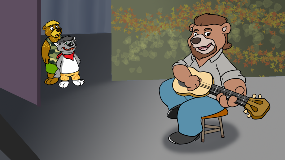 Stan Grizzly sings for the studio audience a song on his soon to be released album. Wally watches, with a smile, while Birch doesn't know what to make of it.