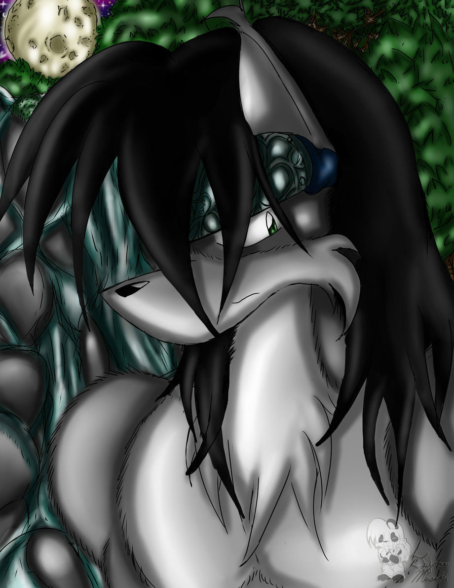 His eyes shown bright in the color of emerald green against the permeating sheen of the pale moon light, an omnipresent gleam showing the a distant fire of a fighters spirit within. The mysterious loner stood at the crest of the falls, an altogether small and stalwart collection of gray stone that had smoothed with the passage of water over their ash-like surface throughout the ages, the height of which stood at the length of about three men. High above, the moon emanated a nocturnal glow that shown bright overhead, gleaming through the canopy of leaves from whence the trees reached out over the forest floor. Flowing locks of pitch black hair trickled freely about the vulpines head, crossed only by what ash-gray ears poked out past the span of an engraved metal stamped cloth head-band, hung close over the crest of his forehead. A muzzle protruded outwards in a sloped, downwards arc, ended with a thick black nose at its center. With a fur coat much the same in that ashen gray hue covering his body, it was offset only by what white highlights stood out at his muzzle, cheeks, neck, chest, and tummy. His structured form like a toned statue fashioned of the finest granite, sculptured to reflect the pronounced texture of a physically fit and adept form in body.