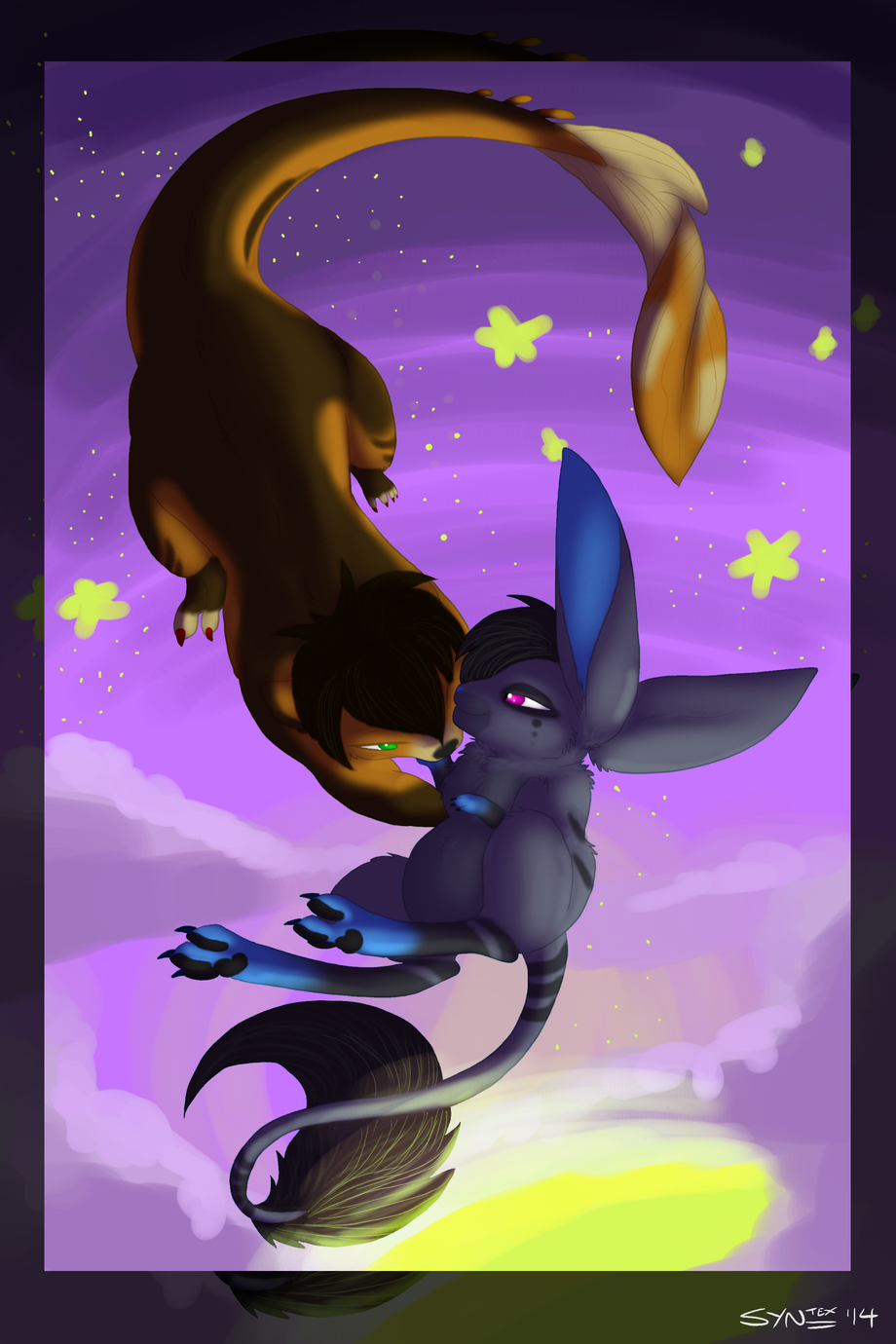 An amazing drawing done by my sweetiepie as our fursonas as feral. She's trying out a new lighting technique here and it looks absolutely amazing if you ask me. I really love how this whole drawing came out, the pose, the expressions, the way that nisa is holding onto Sasha, the amazing lithting and shading along with such a sweet and colorful background, this drawing looks so impressive to me, and I just love it so much. I can't thank my love enough for drawing this for me, she just spoils me way too much..