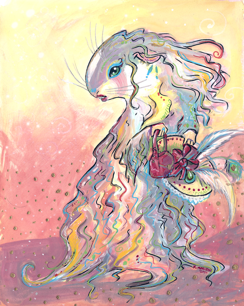 #5 in my Guinea Pig Series installment, Diva Pig, the Texel. The scan doesn't show it, but various areas of the painting are done with metallic gold or silver and glimmer beautifully in the light.