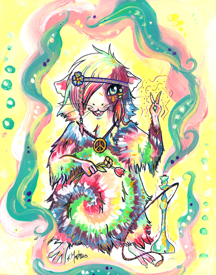 A commission for a coworker as a gift to her daughter~ Fun bright and peaceful Hippie Pig, complete with tie dye fur (and a nice bit of fruit hookah C:)