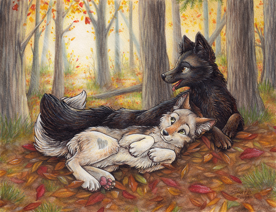 A couple of wolves snuggle up as the leaves begin to fall. Autumn is the coziest season.