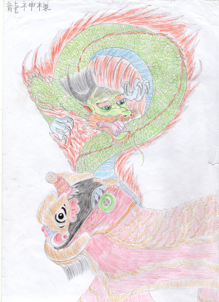 This one's nice and colorful. :) The lung has some nice scales (that must have tormented your hand :o ), and the lion definitely has that costume lion look to it. I would say that a darker background would help pull out the characters better, but that might be a bit more than you're willing to get into for the time being (which is fine).