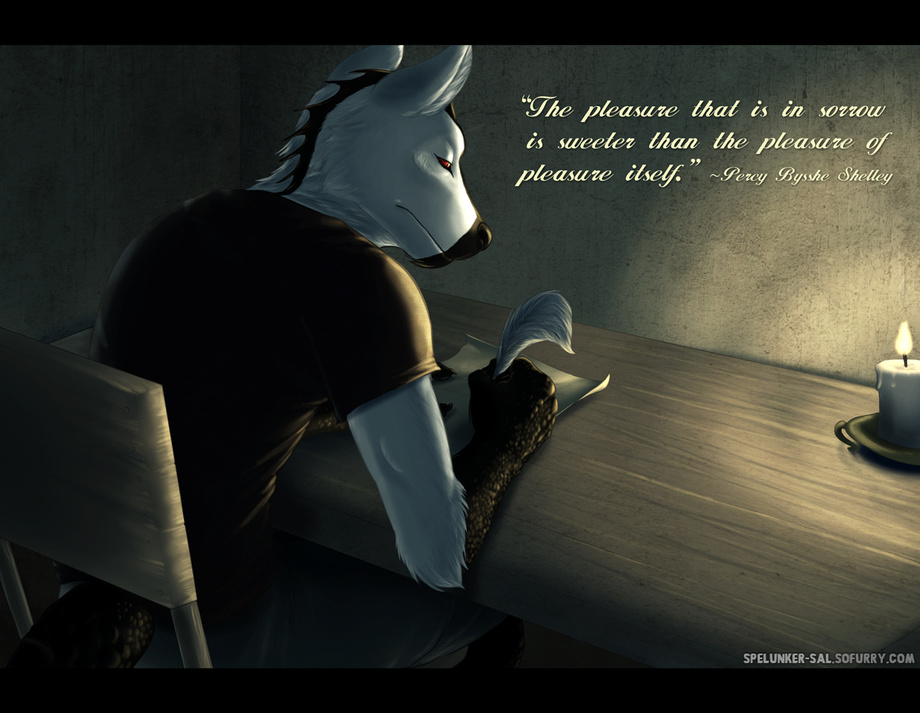 This is a commission I did for AnselmBlackheart on InkBunny during a slave stream of his character writing with a somber theme. The quote reads: "The pleasure that is in sorrow is sweeter than the pleasure of pleasure itself." by Percy Bysshe Shelley