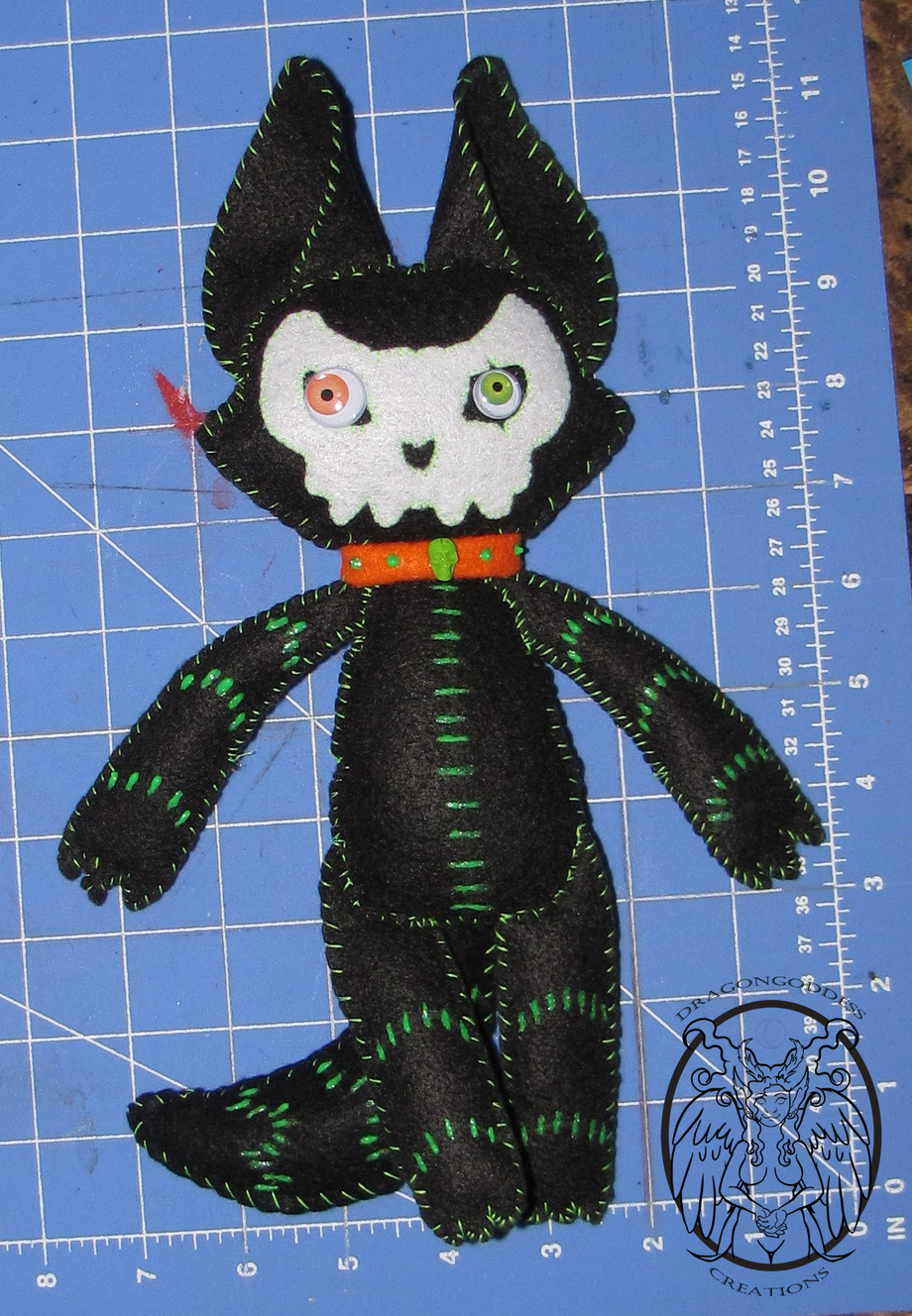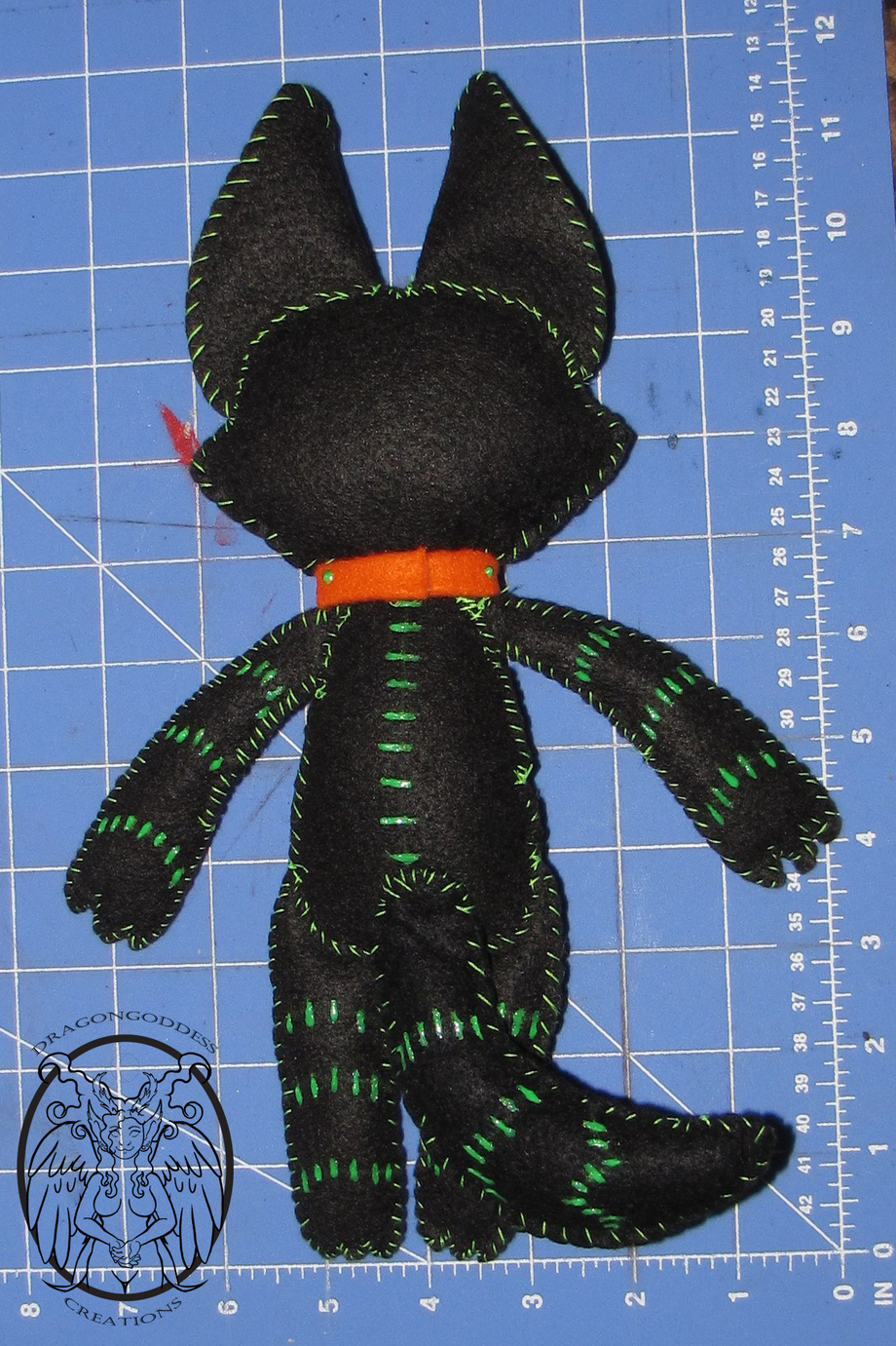 Handmade "flat" voodoo wolf or fox plushie. Made out of felt with hand painted and hand stitches, googley spooky eyes, and 3d green skull. Measures about 11.5in tall and 6in wide.