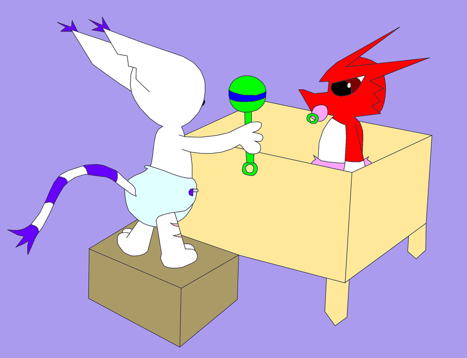 The title is the sound Jason the Shoutmon makes when he is once again babied by Ashley the Gatomon. After strapping him in a pink diaper, she sets him in a crib and shakes a rattle to try and get him into a babyish mood. Requested once again by ComedianCat/ FunnyFeline.