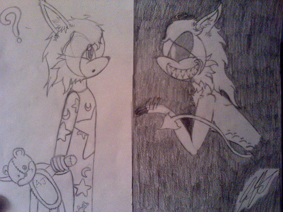 RIGHT: A semi-demonic form of Aeron, no light can be seen in his appearance or coming from him whatsoever. His sneer infers his deviousness and wanton for disaster and all things wicked. He says "hi" to the little Aeron, who looks very confused at this.