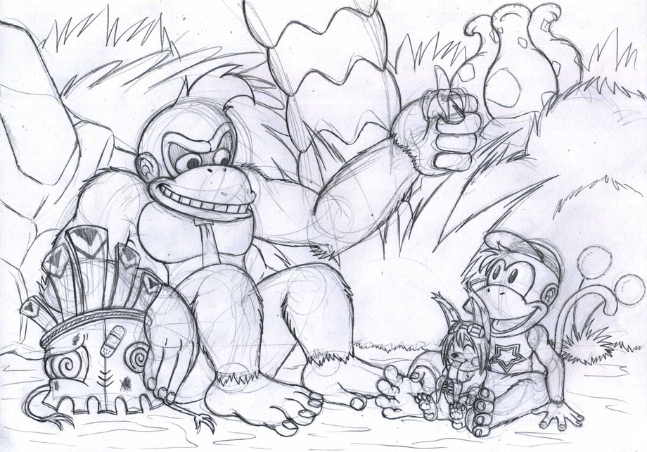yet another NNR sketch! yeah I know, I'm slow with everything else, but that happens when your rl is as chaotic as mine x.x things will come, just be patient <:3 anyway, here we have DK and Diddy taking a break and sharing the bananas they got back with the little chu :3 I kinda like the final result, first time I ever drew DK too X3