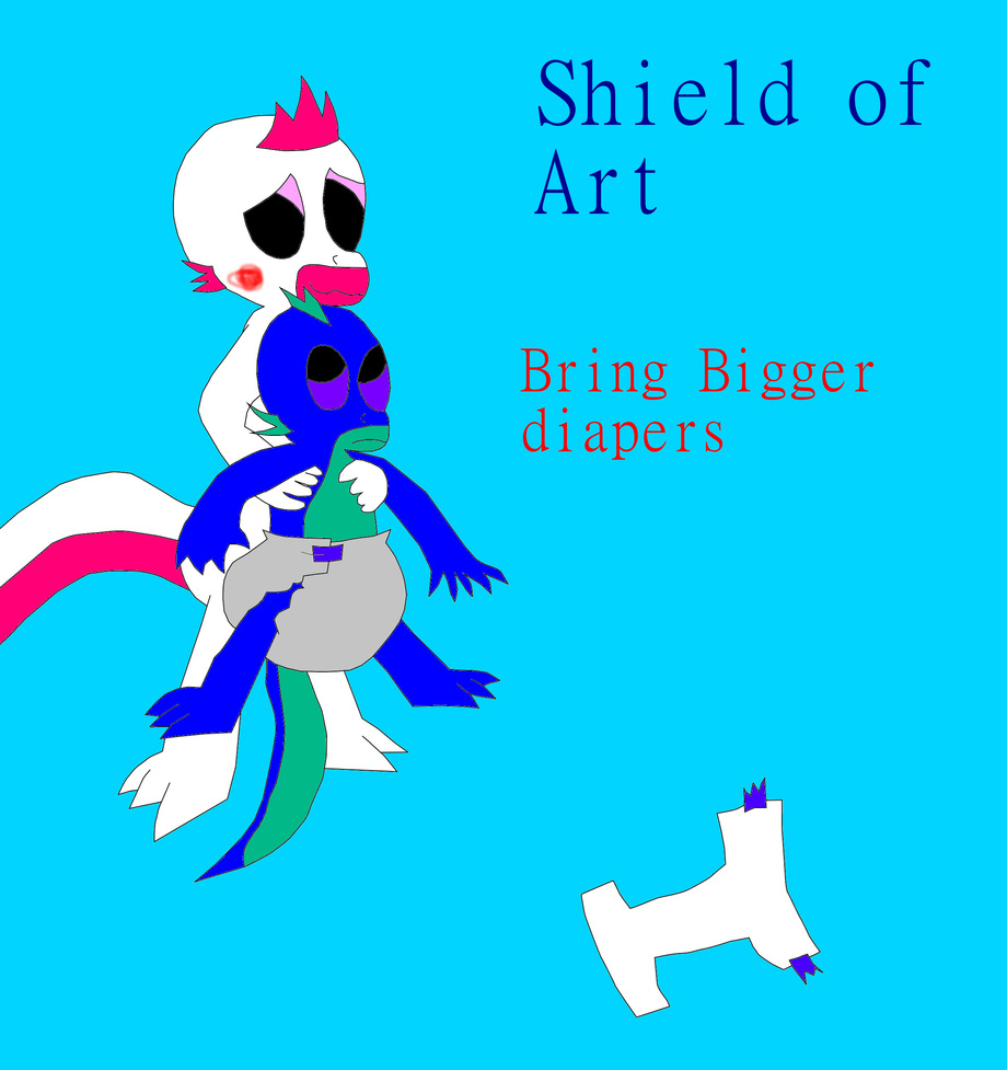 I wanted to draw a new cover for my Shield of Art series. I also wanted to draw this for a long time and I love the end result. Basically, Takoda was wearing a baby diaper in her teenage form while Jeris watched her with love. Suddenly, the straps broke and the diaper fell off, leaving poor Takoda bare. Then, someone barged into the room without knocking, not wanting to be seen bare, Takoda grabbed Jeris and used him as a shield for her nude area. Ain't they bloody cute?