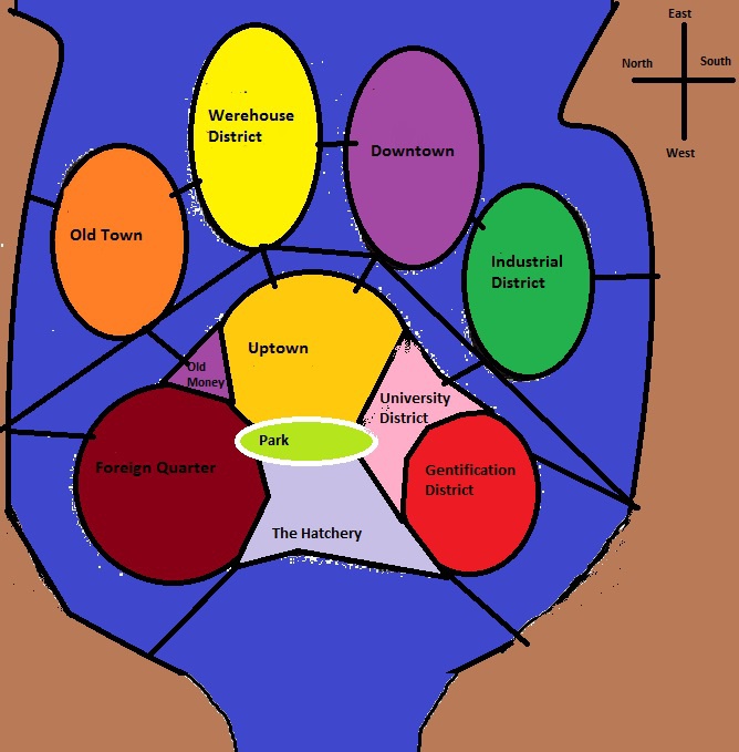 Now I believe in the adage of 'show, don't tell', but I'm no good artist, so I'll have to show you in future stories. I don't want to info dump, but I do want to provide some basic information, so here is a quick rundown of the major neighborhoods of the city, which you can see labeled on the map: