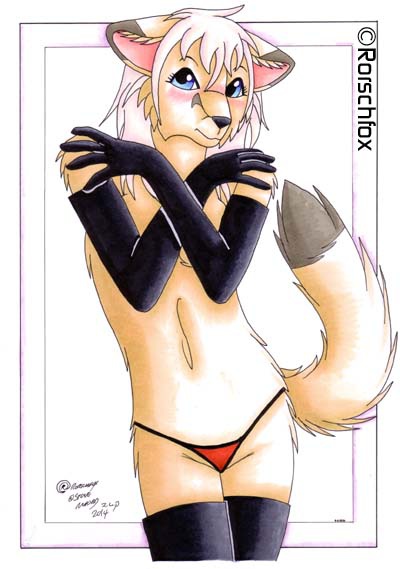 Marcella, a cute arctic fox fem, wearing gloves, boots and panties, and blushing as she playfully crosses her paws across her chest. She's topless, but modest.