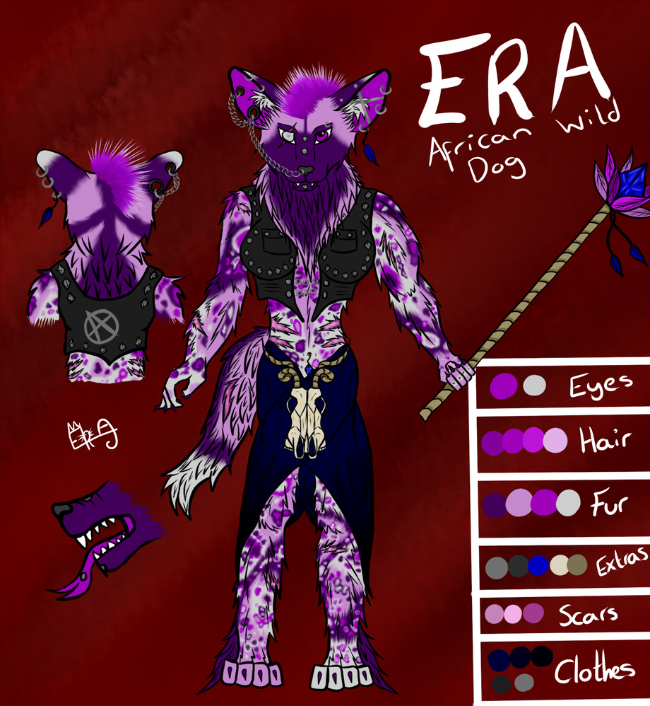 Sooooo after saying i wouldn't make any more characters, i then ignored that and made Era. She's a punky african wild dog witch doctor ^^ I tried to stick to pretty traditional patterns but more different colouration. (Doubting whether i'll be able to recreate the markings again though) She's completely blind in her left eye although that doesn't mean she won't see you coming. She's never parted with her staff/stick thingy, and you'll be in big trouble if you take it off her. Warning she's a tiny bit of the insane/crazy side.