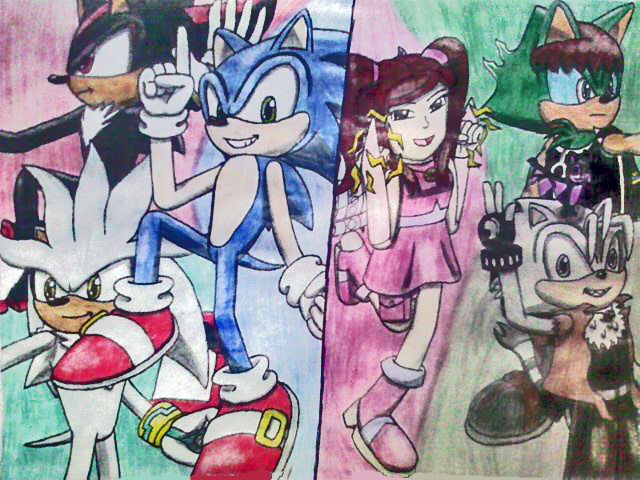 On the lefthand side, you have the famous Triple S trio! (Whom belong to Sega, of course, not me.) Sonic, Shadow and Silver.You know all about them, I presume. (if you don't..... o.o I dont even know what to say....) So I'm going to tell you about the thre characters on the RIGHT. My fan characters!