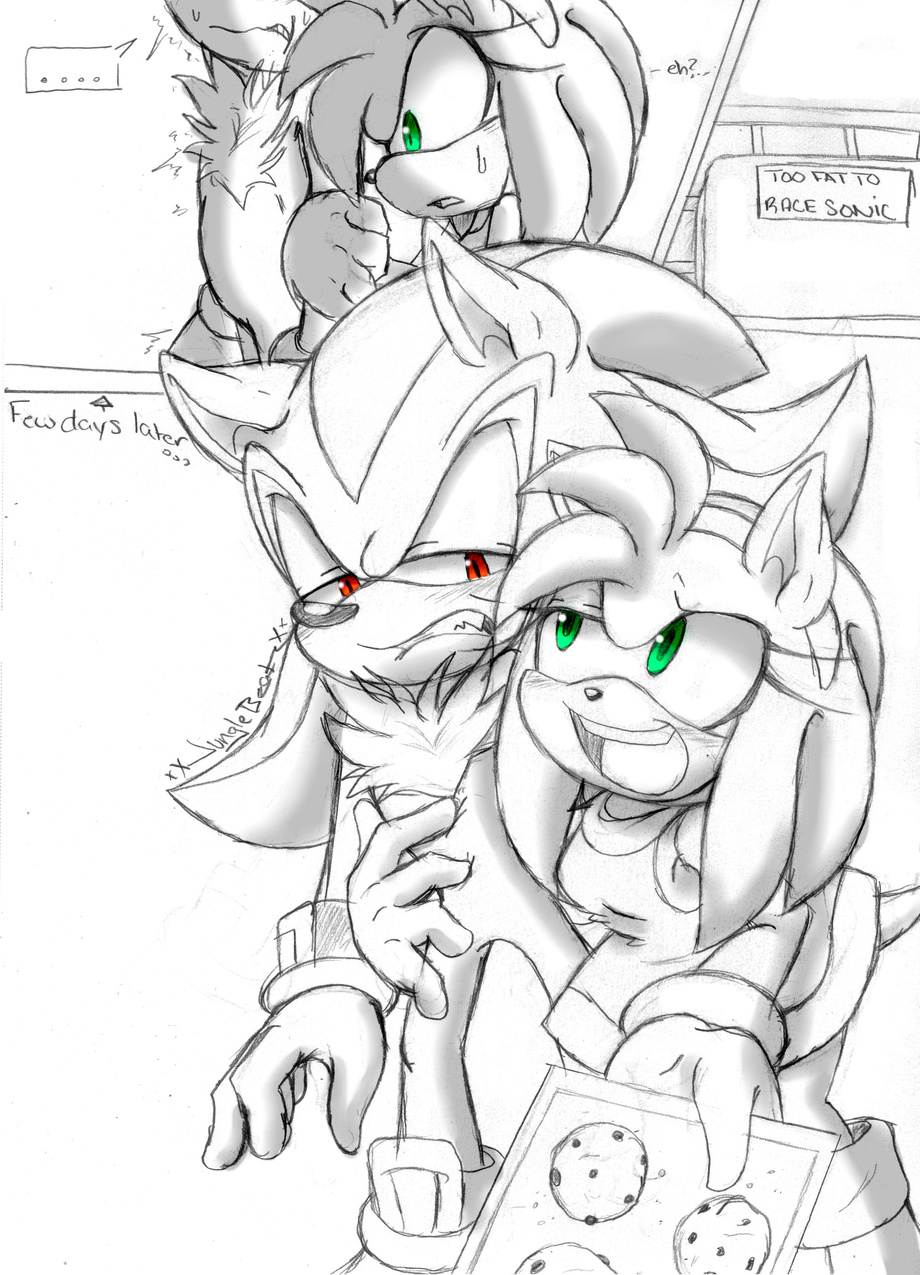 Amy: Yay! And I really do promise that I won't feed you too much cause I know you love sweets especially my cookies! *pokes her fingers in Shadow's stomach*